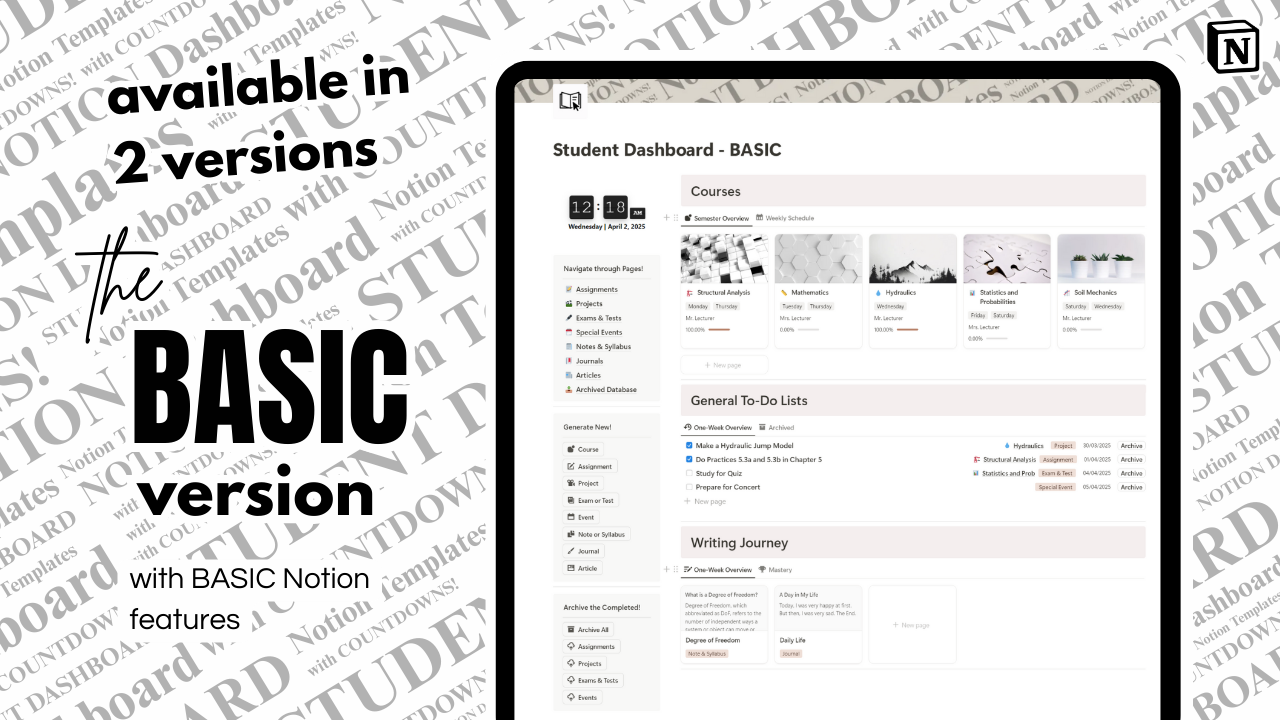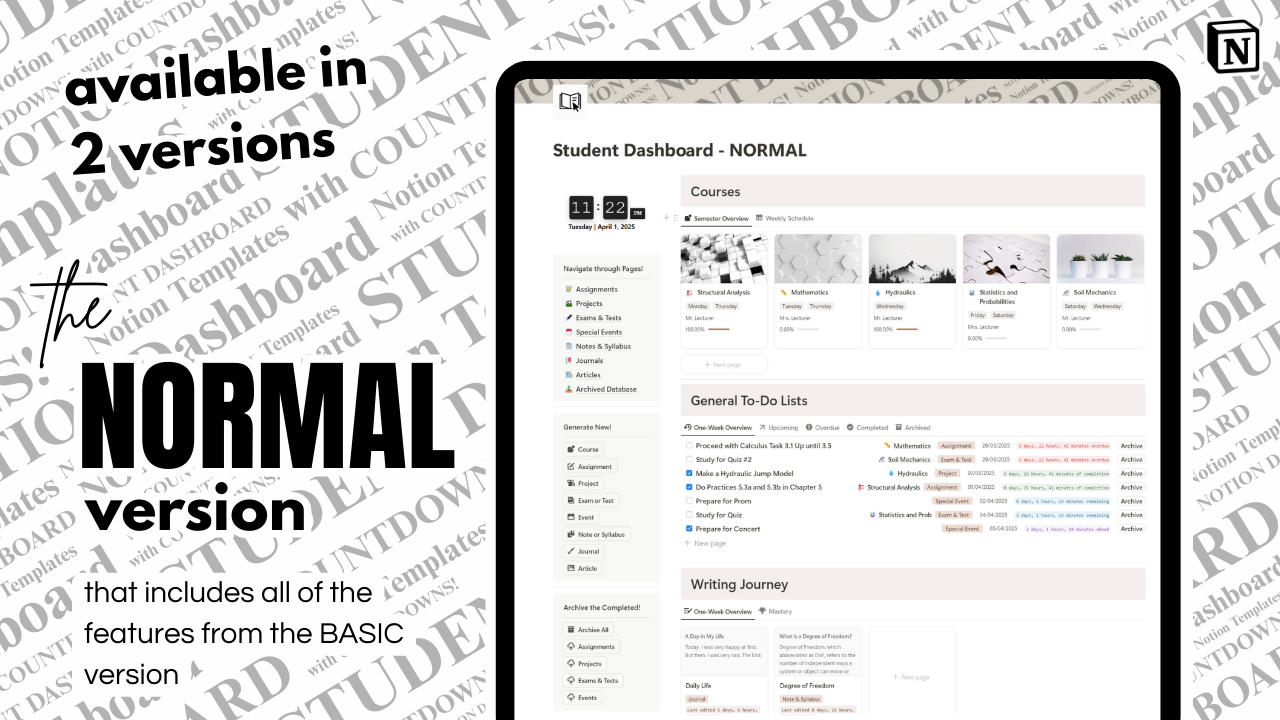 This Student Dashboard is your all-in-one Notion hub designed to help you plan smart, track progress, and grow your academic life — with built-in countdowns, archives, and mastery logs.